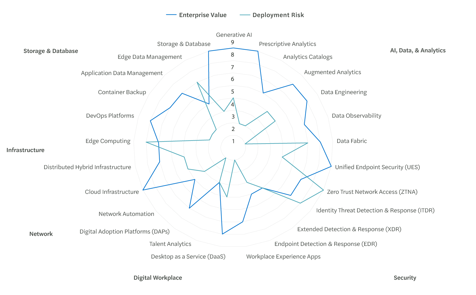 The study cuts through the noise of market trends by focusing on the practical adoption plans for 45 key technologies across six domains—AI & Analytics, Security, Digital Workplace, Network, Infrastructure, and Storage.2 By analyzing study findings and real-world scenarios, we can construct a reliable compass. This compass points toward where your peers are finding value and how they are structuring their technology stacks for resilience and growth. The “enterprise value” factor in this road map appraises technologies based on their ability to increase cost efficiency, improve speed and agility, drive innovation or competitive differentiation, and enhance the employee experience. Conversely, “deployment risk” considers potential challenges such as cybersecurity risks, implementation costs, talent restraints, macroeconomic uncertainty, and architecture complexity.3