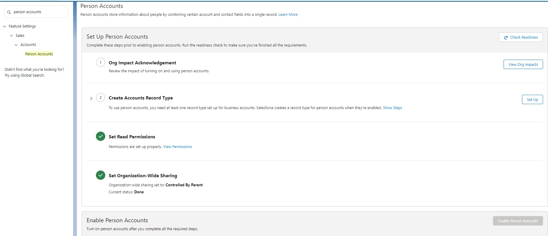 Tip: Review the considerations for using Person Accounts. Then try the Person Account setup wizard in a sandbox to test the features and preview how the changes may affect your Salesforce CRM.