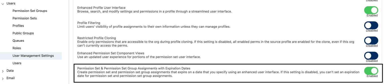Assigning a permission set or permission set group to users for a defined amount of time can be helpful for specific projects, when team members are covering for someone on leave, or during other similar circumstances.