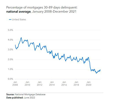 In addition, the Fair Lending/Community Reinvestment Act (CRA) and SEC cybersecurity disclosure guidance are regulations that nonbank sellers and servicers must navigate through. The Federal Housing Finance Agency (FHFA) has recently announced they will be making on-site reviews of nonbank sellers and servicers. The Office of the Comptroller of the Currency (OCC) recently issued consent orders to a variety of institutions due to inadequate and failed risk management programs. If these weather conditions weren’t enough, there may be an increase in credit risk challenges as consumers may begin to become past due on credit cards, auto loans, personal loans, utility payments, rent, and mortgages as COVID protections are lifted. While overall delinquencies on mortgages have dropped from a high of 4.2% in January 2009 to a low of 0.6% in April 2021, trends are showing upward movement to 1.0% in December 2021, as noted in the chart below.4