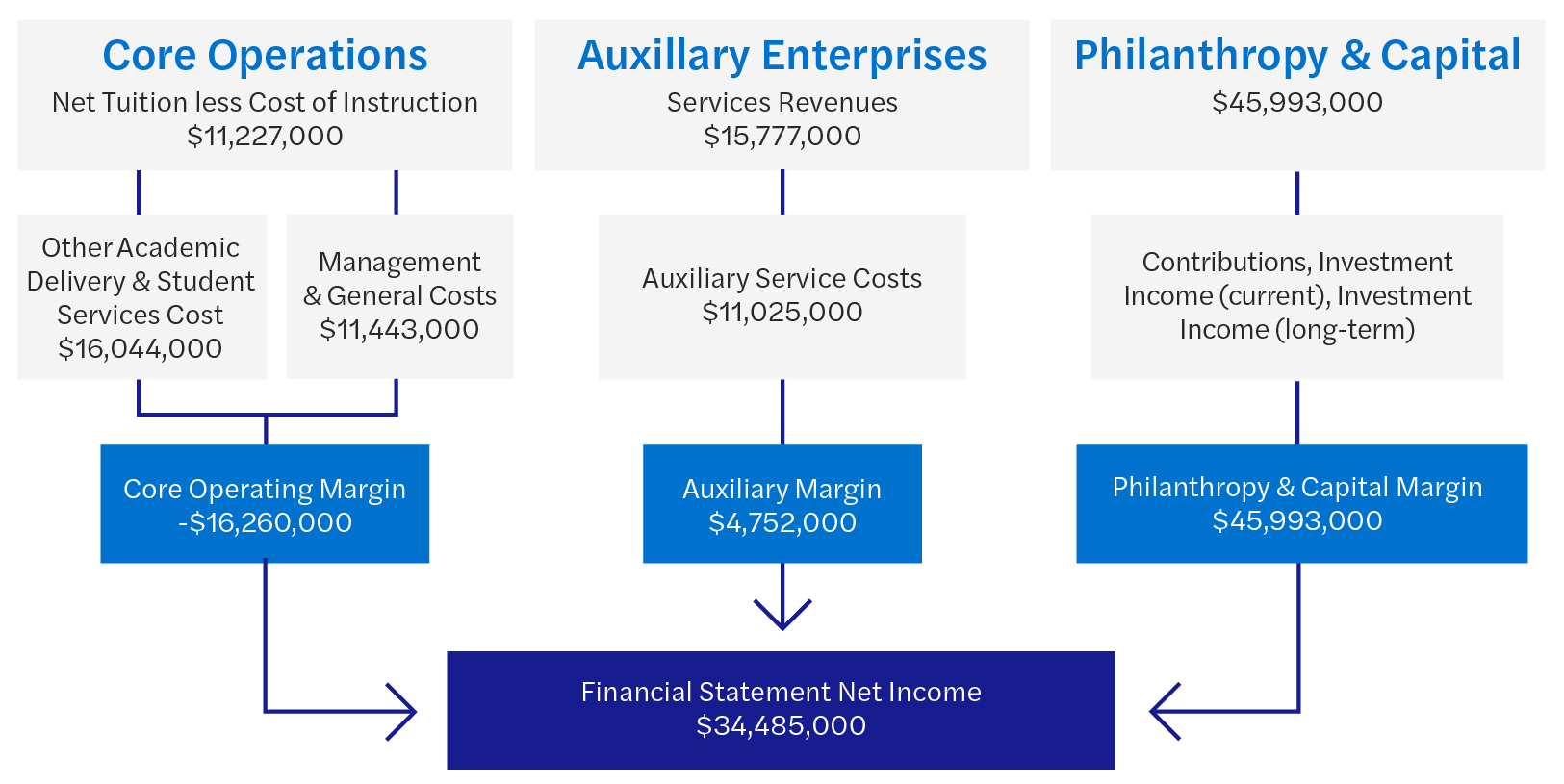 The truism related to this idea of margin is: No margin, no mission. But what “margin” are we talking about? Does this mean positive cash flow? Accounting net income? Budget surplus? Or some other idea that indicates surplus? All these ideas have merit, but for teaching institutions, the main focus should be on core operations.
