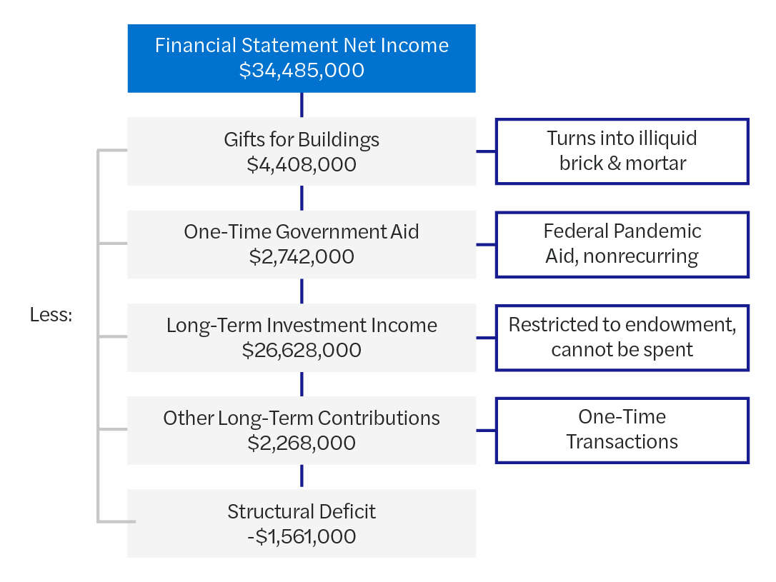 A current problem with this, however, is the perception of generally good financial results achieved over the last couple of years because of substantial investment gains and governmental funding tied to the pandemic. In addition, at some schools, one-time gains from assets sales and recent fundraising success have hidden core operating deficits. Table 2 below illustrates this well. It is based on real financial statements in 2021.