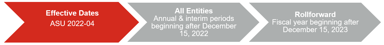 ASU 2022-04 is effective for all entities, except for the rollforward information, for fiscal years beginning after December 15, 2022, including interim periods therein. The rollforward information is effective for all entities for fiscal years beginning after December 15, 2023. Early adoption is permitted.
