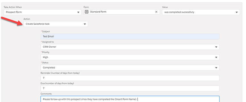 You can even create a Salesforce task with a Conditional Completion Action that will email the prospect owner when a prospect takes action with the priority level, a task reminder, and comments about the task.