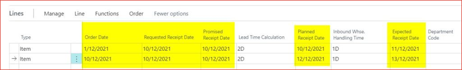 If you try to change the date on the Header, Business Central will ask if you want to update the dates on the lines. Answering “yes” will update the dates on the lines. You can have different dates between the header and lines.