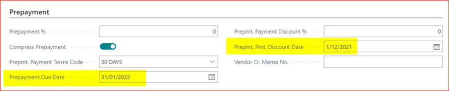 Prepayment Payment Discount Date – Used to be eligible for payment discount if you do early prepayment. It’s calculated based on the Document Date + Prepayment Term Discount Date Calculation. If there’s no discount associated with the prepayment terms, this date will be equal to the document date.