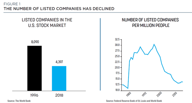 First, let’s go over why there has been a proliferation of these types of investments in the last few decades. With many changes in SEC regulations, namely Sarbanes-Oxley, the additional cost of being a public company has forced many companies away from the public markets. This does not mean that those companies are not profitable or valuable. It just means they are focusing on keeping their overhead lean and returns higher based on their specific strategies, while not having to comply with SEC regulations and answering to numerous investors and market analysts. This has created a significant opportunity for private capital to organize and deploy strategies specific to different sectors in the economy. Since the ‘90s, the number of public companies has almost been cut in half (see Figure 1). This, of course, also has shrunk the opportunities for regular investors to own U.S. domestic companies. Hence, many investors have looked to the private markets to diversify their portfolios.