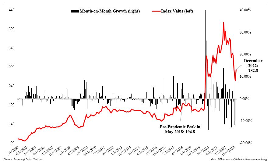 One can see that in addition to the GSCPI (Chart 1) peaking and since moderating, the growth in air freight costs has decelerated three straight months since September 2022 with only a recent uptick of +11% in December, signaling there may be some cyclicality left to filter out in producer prices as we progress beyond the pandemic. Although both the aggregate GSCPI and underlying import air freight cost indexes appear to be correlated in the short term, business leaders should not lose sight that import air freight costs in the supply chain are still 45% higher than their previous pre-COVID peak in May 2018 (May 2018 – 194.8 versus December 2022 – 282.8).
