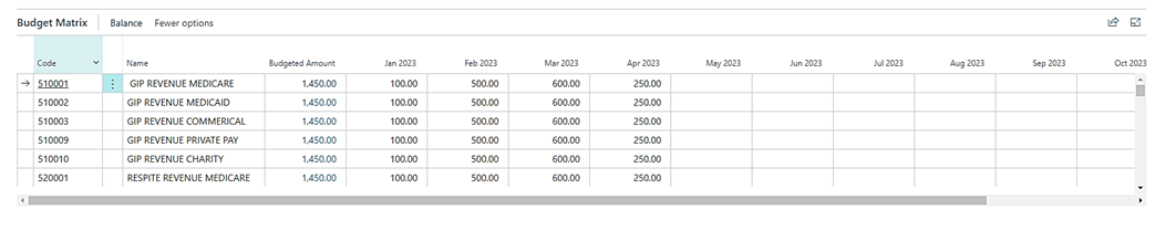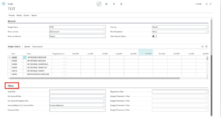 - The G/L Accounts listed in the Budget Matrix default to your Income Statement Accounts; use the Filters section below to update what appears in the Budget Matrix.
