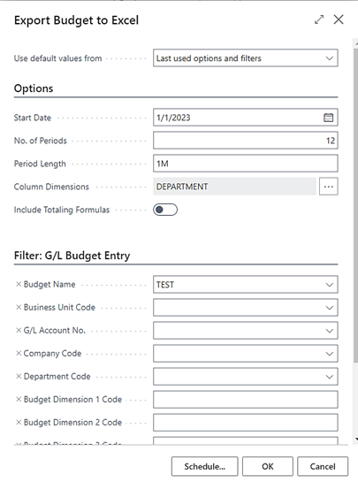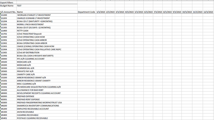 - This will open an Excel sheet with all your G/L Accounts with columns for the Department Code and all the periods (in this example, “months”).