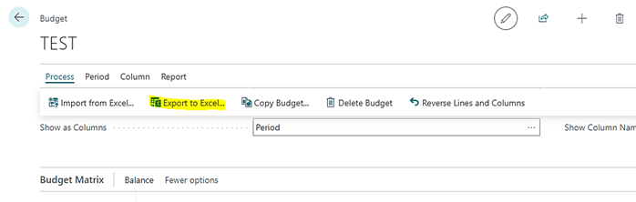 - Then, go back to Business Central in the same G/L Budget and select Process > Import from Excel.
