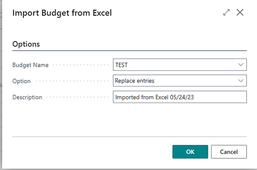 - A pop-up screen will appear with Options fields to confirm the budget name, add or replace entries, and add description information.
