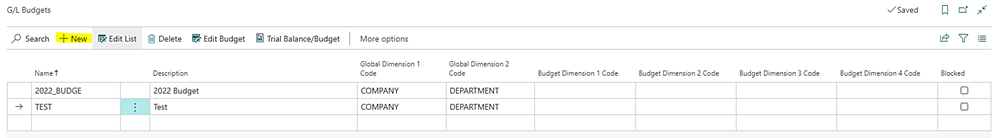 - Name the budget and provide a description if needed; then add any applicable dimension information.