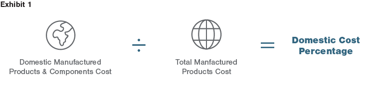 To determine eligibility of the Domestic Content Bonus Credit, applicable projects must apply the Adjusted Percentage Rule. On a high level, a certain percentage of the product must be manufactured domestically. The Adjusted Percentage Rule requires the taxpayer to first calculate the Domestic Cost Percentage (the formula shown in Exhibit 1) and compare it to a defined threshold (the “adjusted percentage”). The Domestic Cost Percentage is calculated by dividing the Domestic Manufactured Products and Components Cost by the Total Manufactured Products Cost calculated for the applicable project. Obtaining the direct material and labor cost information required for this formula from suppliers—both foreign and domestic—may be a challenge in reality. Suppliers will need to disclose their internal details of what their products cost to make, along with the split between their direct and indirect costs. Whether the demand for the Domestic Content Bonus Credit affects the availability of this kind of information is yet to be seen.