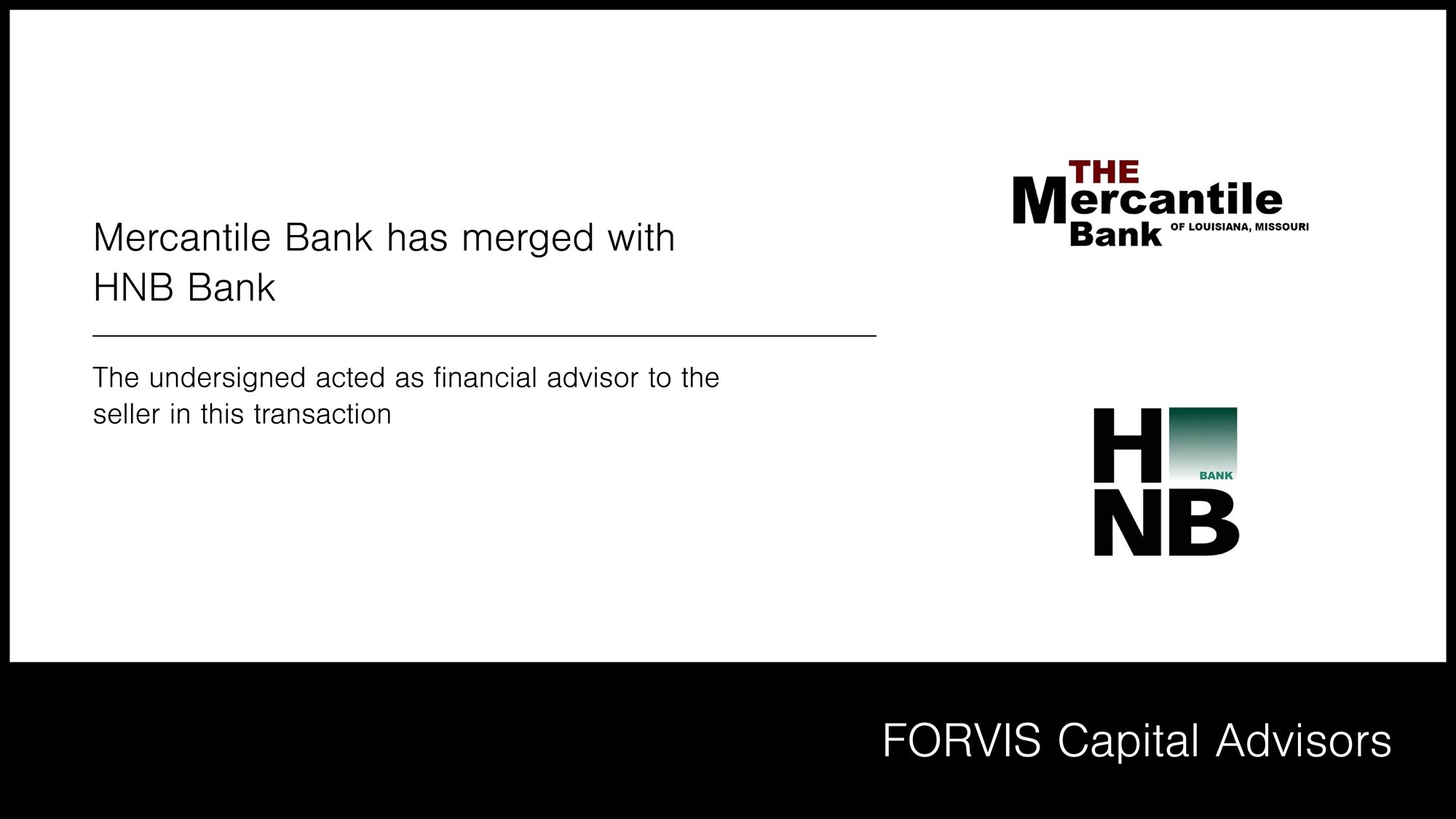 The bank engaged Forvis Mazars Capital Advisors to run a targeted sell-side process to help ensure value for its shareholders while also identifying a merger partner who would be equally committed to the community and its employees. Forvis Mazars Capital Advisors leveraged its deep experience and network in the industry to run a customized process focused on finding the right partner for Mercantile Bank.