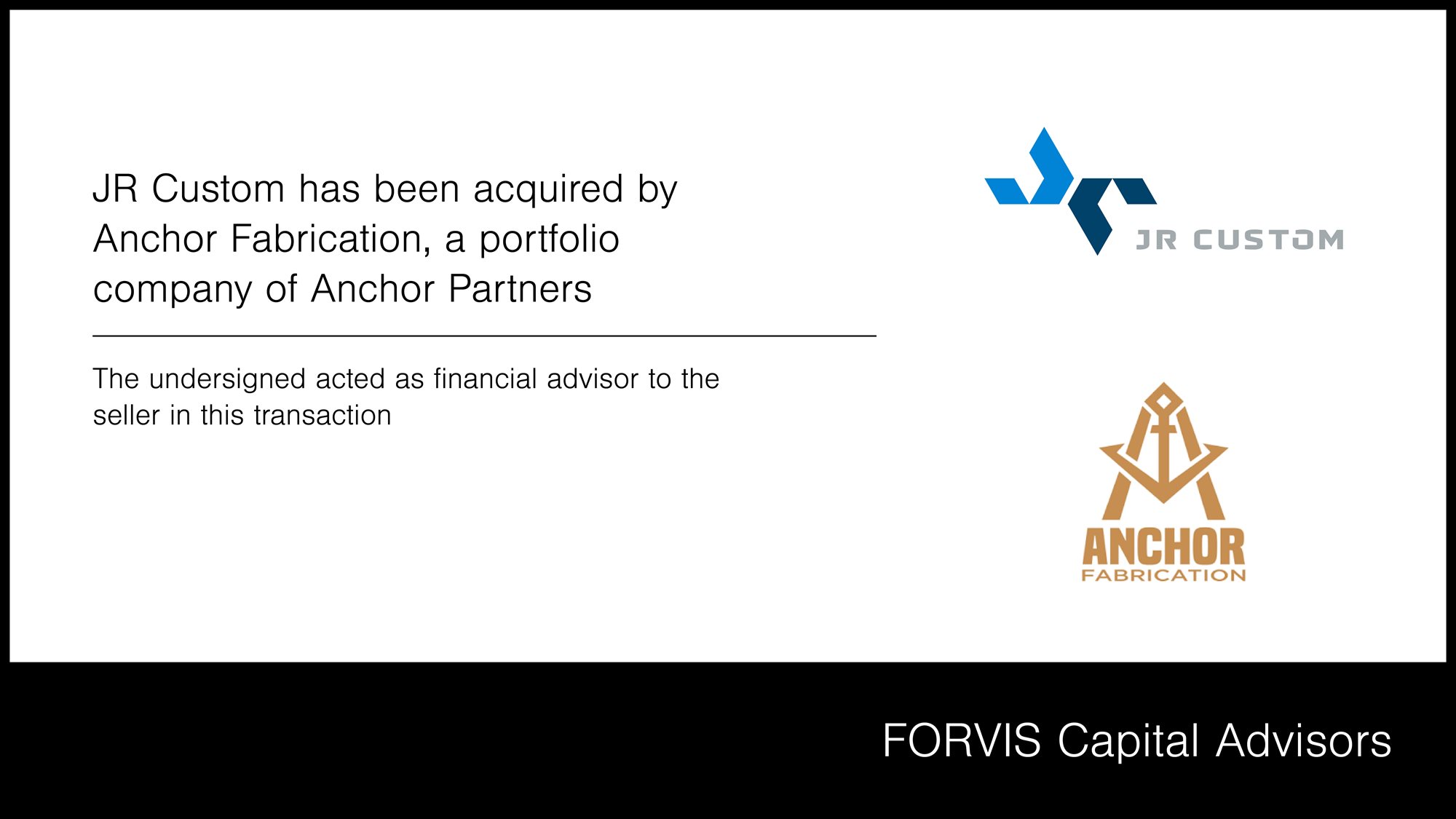 Forvis Mazars Capital Advisors is pleased to announce it advised JR Custom Metal Products Inc., a Wichita, Kansas-based manufacturer of turnkey, custom metal fabrication products, in its sale to Anchor Fabrication, an operating subsidiary of Anchor Partners.
