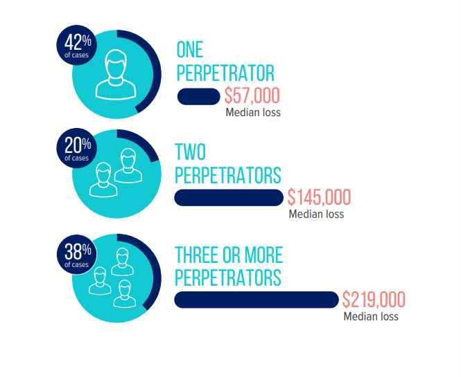 Employees collaborating to circumvent internal controls—also known as collusion—can make fraudulent activity difficult to detect. Even the most well-rounded internal control system with proper separation of duties in place must, at some point, rely on employees to be honest.2 In the 2022 Report to the Nations, the Association of Certified Fraud Examiners (ACFE) found that a higher number of perpetrators increases the median losses suffered by organizations.3