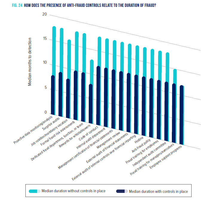Data analytics is an effective detective control to help identify potential fraud in accounts payable. According to the ACFE’s 2022 Report to the Nations, automated transition/data monitoring can help reduce fraud duration to six months.