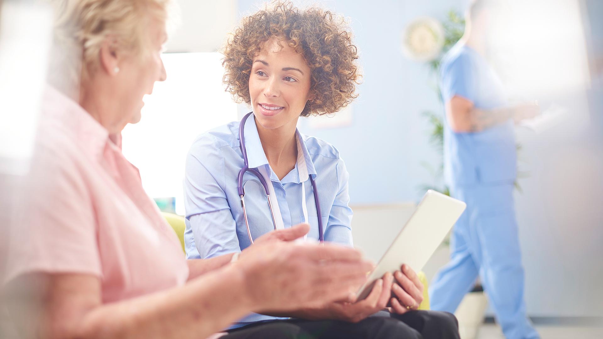 a female doctor sits and listens to a senior woman sitting down in a consultation room . They are sitting in a defocussed hospital clinic waiting room . The doctor is wearing no white coat and holding
