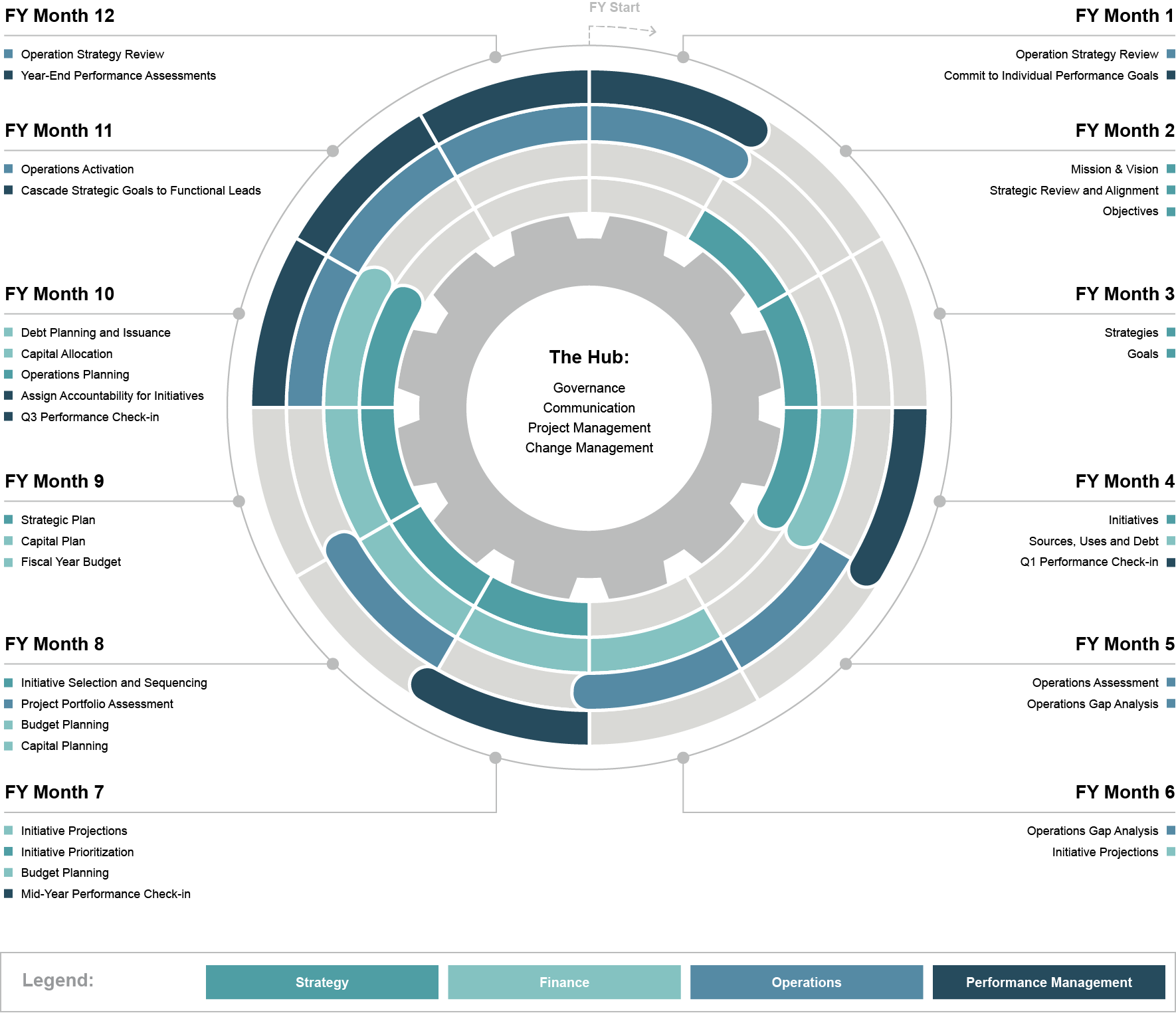 The “Wheel” represents choreographed planning and execution functions—performance management, strategy and business development, finance, clinical and administrative operations that guide the business toward fulfilling its mission. Each function has distinct tasks with defined timing that are essential for a health system to astutely understand market changes, develop response tactics, finance and execute approved strategies, and evaluate and reward staff. Intentionally designed to accommodate each organization’s unique characteristics, the “Core” and “Wheel” create the integrated platform to help drive exceptional execution by fully aligning the organization around planning, performance, and accountability.