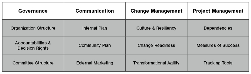 In many cases, the business thesis driving organic and/or transactional growth demands a fresh look at the organization’s overall operating model, i.e., the fundamental platform that includes governance, leadership, market strategies, core processes, and other critical operating characteristics. Yet rather than rigorously examine their existing operating model in the context of the transforming enterprise, leadership teams simply and habitually insert a carbon copy of corporate management structure that can complicate and confuse planning and obscure decision-making rights and accountabilities. The familiarity of these legacy organizational constructs provides an unwarranted sense of safety, as the resulting misalignments can hinder operational effectiveness and obscure the required linkage to the execution of strategic initiatives. The business strategy and delivery of services have changed, but legacy team structures, leaders, and ways of working live in conflict with the new business. Despite promises of value creation to endorsing, regulating, or investing organizations, e.g., state and local governments, philanthropic stakeholders, or private equity, the resulting operating model is ill-suited for an increasingly outcome-focused, consumer-based industry.
