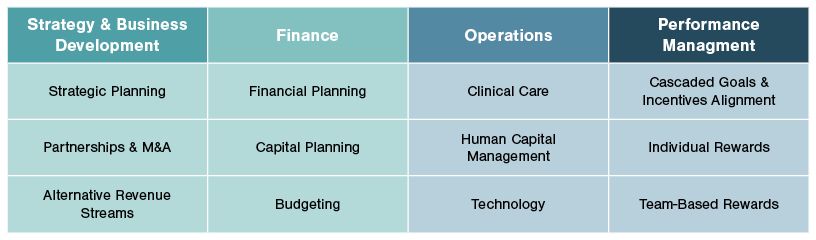 - Chiefs under the CEO who are generally asked to interpret a perhaps vague vision through the lens of their personal responsibilities and associated agendas; various leaders of nurses, HR, IT, finance, and other functions who are often left to do their best operationally with little context for strategic goals or initiatives; clinical managers who worked their way up the ladder who may have little or no formal business or management training; and