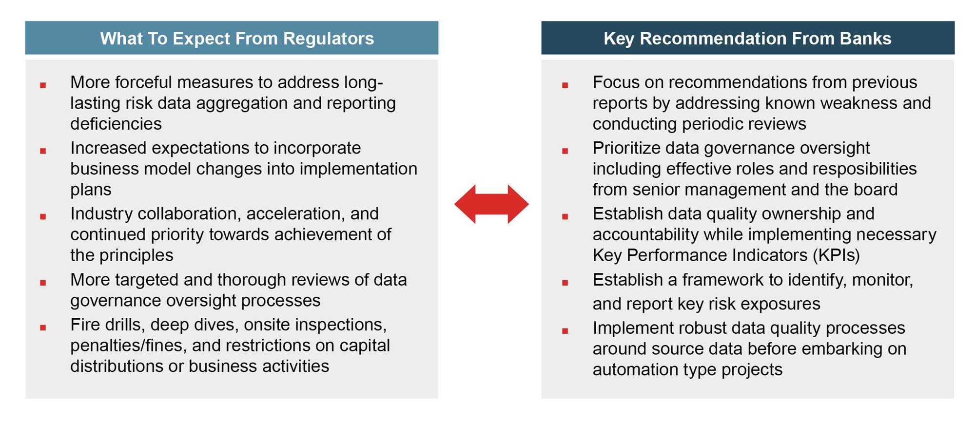 Data Awareness and Accountability: Ensure the board and senior management remain committed to strengthening the data culture along with data quality, risk data aggregation, and risk reporting capabilities. This should involve appropriate budgeting and resources dedicated to implementation, as well as visibility and accountability of key data governance roles, data quality dashboards/KPIs, and risk reporting leveraged by senior management.