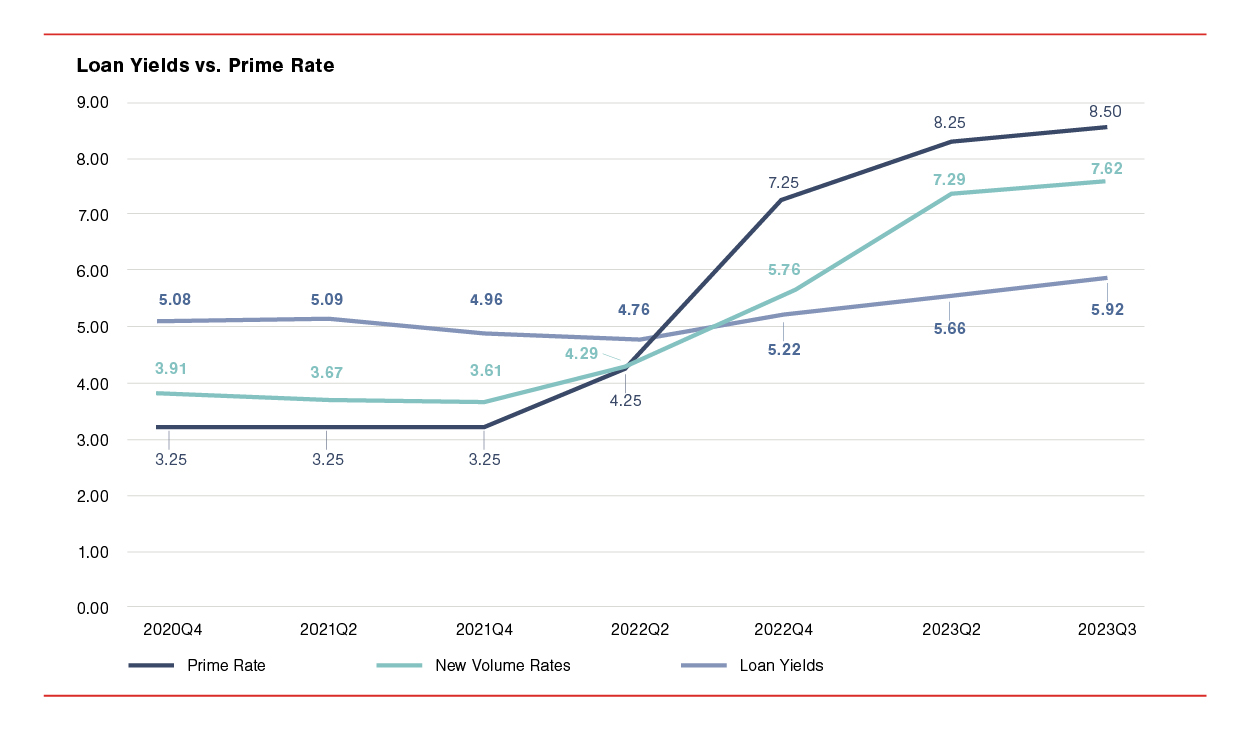 Since mid-2022, there has been a dramatic shift. Rates offered on new loans, while still increasing, have dropped to a negative spread to prime. This trend worsened by the third quarter of 2023 to nearly 100 basis points below prime.