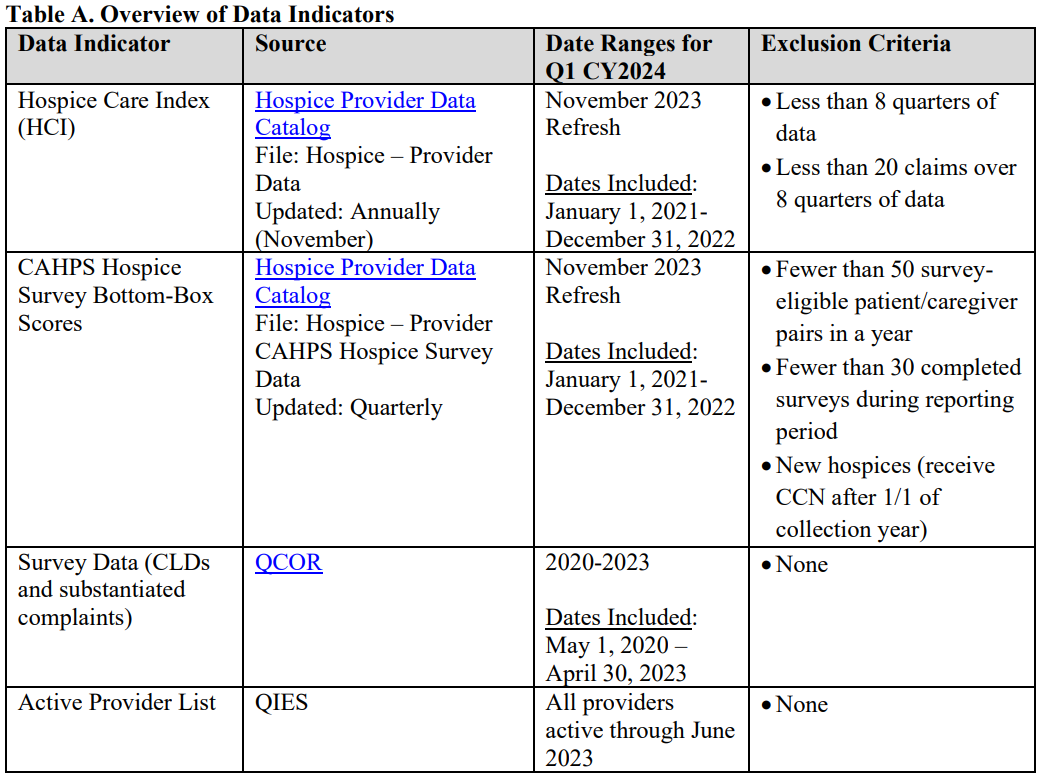 - The hospice has data from at least one algorithm indicator, including CLDs, substantiated complaints, HCI, or CAHPS Hospice Survey.