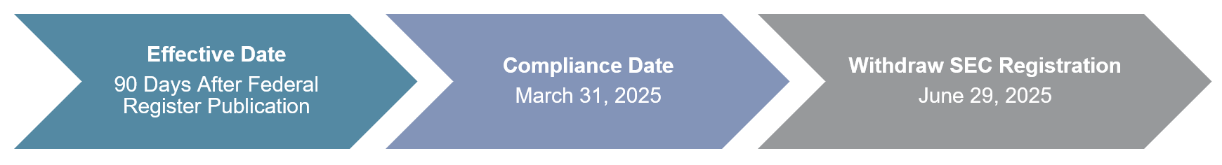 These changes are effective 90 days after Federal Register publication. An adviser relying on the Internet Adviser Exemption must comply with the rule, including the new Form ADV representation, by March 31, 2025. An adviser that is no longer eligible for the exemption and does not have a basis for SEC registration must register in one or more states and withdraw its SEC registration by filing a Form ADV-W77 by June 29, 2025.