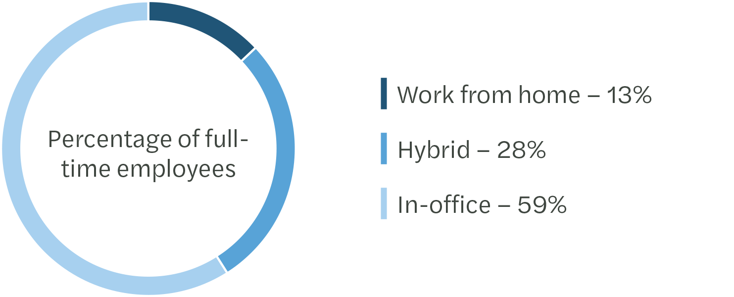 Other industries are offering hybrid work models where there were previously in-person-only requirements.1 A 2023 remote work study (see chart below) shows that currently 59% of employees are working in an office full time. The remaining 41% of jobs that offer remote or hybrid positions are likely more appealing to job candidates.