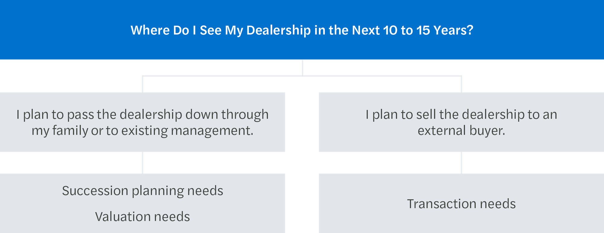 Due to the consolidation of the industry, dealers may want to consider stopping and reflecting on where they see their dealership in the next 10 to 15 years. While 10 to 15 years may seem far down the road, it's pertinent to plan now to understand future impacts and consider a suitable succession option from a financial and operational standpoint.