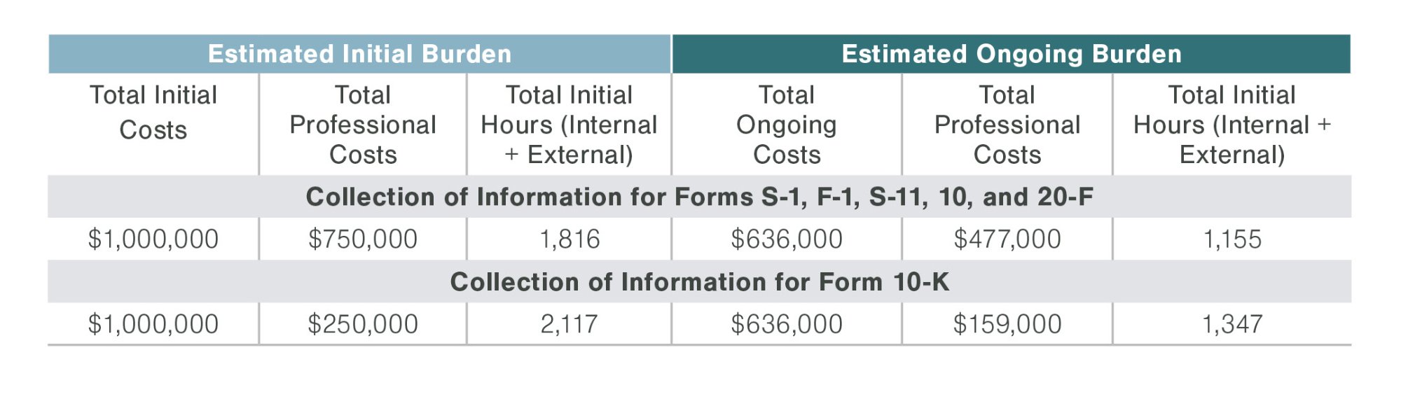 - 1See PRA Table 3. Estimated Total Burden Hour Effects of the Final Rules in the SEC’s final rules: The Enhancement and Standardization of Climate-Related Disclosures for Investors.