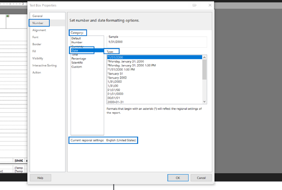 - Under the Type section, select the desired format. In this case, we would select Monday, January 31, 2000. Note: Date formats beginning with an asterisk (*) will reflect the regional settings of the report. The Current Regional Settings can be found at the bottom of the Text Box Properties window.