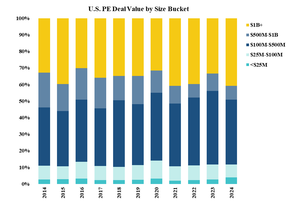 Source: Pitchbook, U.S. PE Deal Value by Size Bucket, as of September 30, 2024.