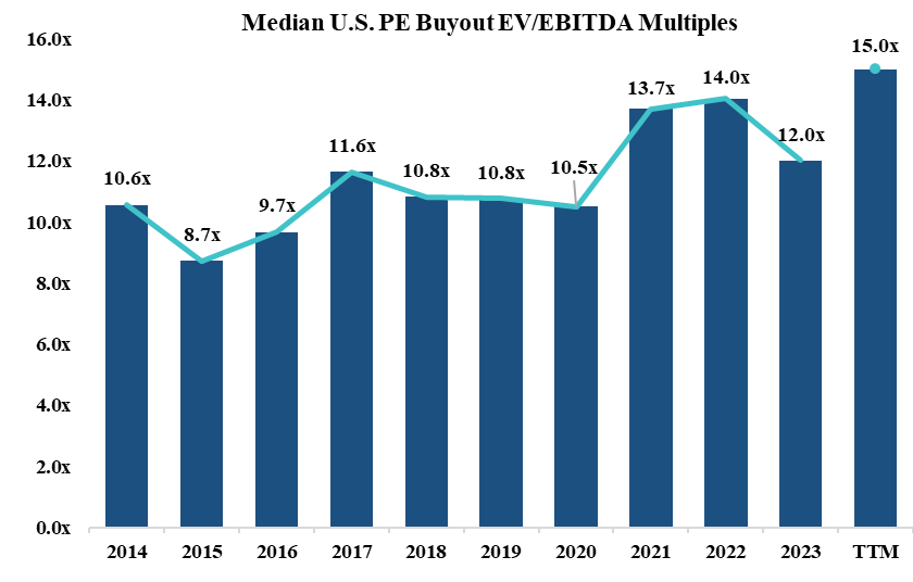 - In essence, transaction size can be critical, and one needs to consider this when assessing transactional valuation multiples. The above table, “Median U.S. PE Buyout EV/EBITDA Multiples,” presents the median enterprise value/earnings before interest, taxes, depreciation, and amortization (EV/EBITDA) multiples over the past decade. The average deal size is over $1 billion in 2024, while it was less than $700 million in 2023. This size differentiation is a critical factor in the out-sized valuation multiple of 15.0X for the TTM period ending September 30, 2024, compared to the longer-term average of about 12.0X (recorded in 2017–2023).