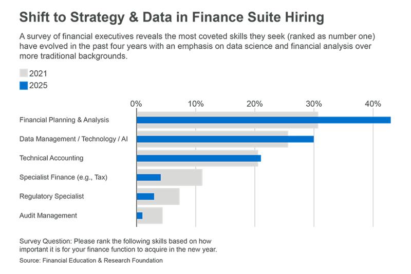 Demand will escalate for technology-savvy professionals in the finance suite in 2025. As the following chart illustrates, there has been a shift in finance suite hiring priorities from 2021 to present, with a growing emphasis on data-driven skills.