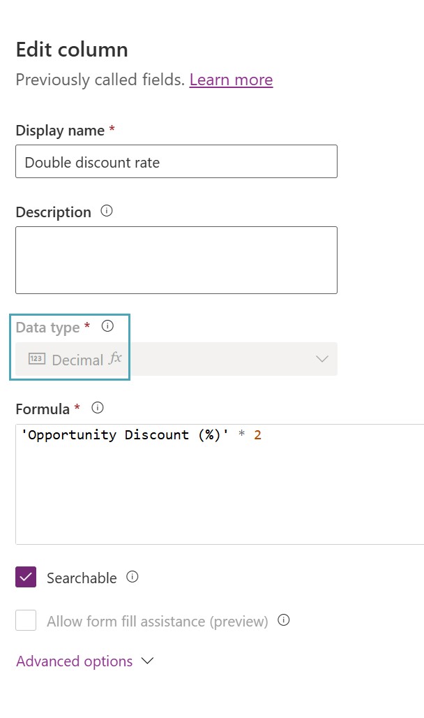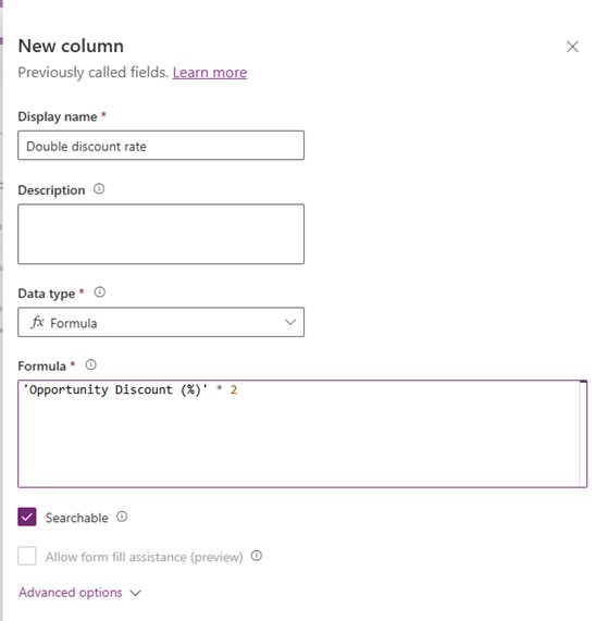 - Select any additional properties, like “Searchable,” if you want this column to be available in views, charts, dashboards, and Advanced Finds.