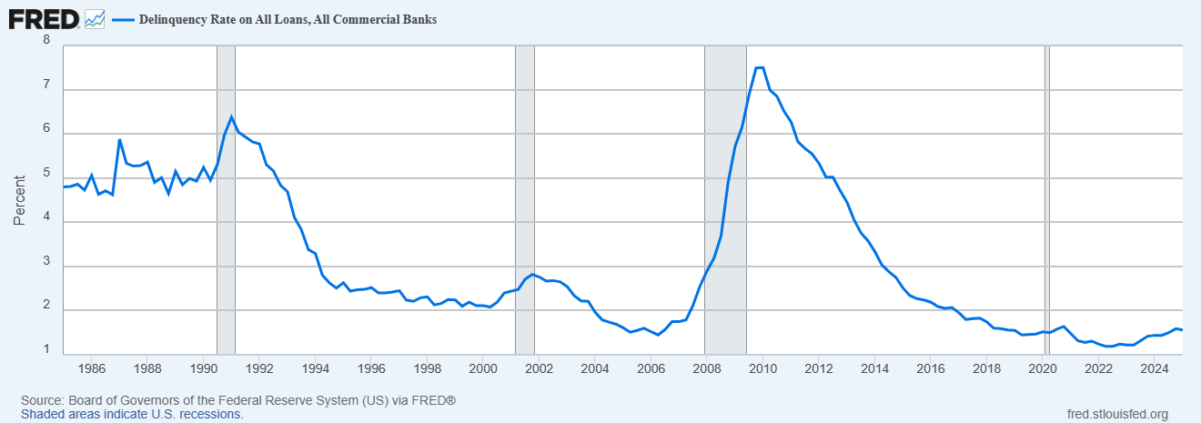 Based on reports published by the Federal Reserve System, loan delinquencies are trending upward in virtually every category. The following chart includes all loan types and reflects a steady increase in loan delinquencies since hitting a low point in 2022. The lower delinquency levels appear to have mainly resulted from government programs during and after the pandemic, which injected significant cash into the economy.