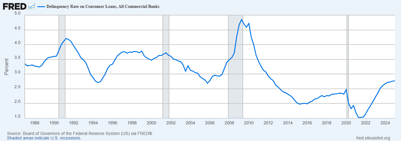 While most loan types are reflecting higher delinquency rates, consumer loans have seen the sharpest increase, as illustrated in the following chart.