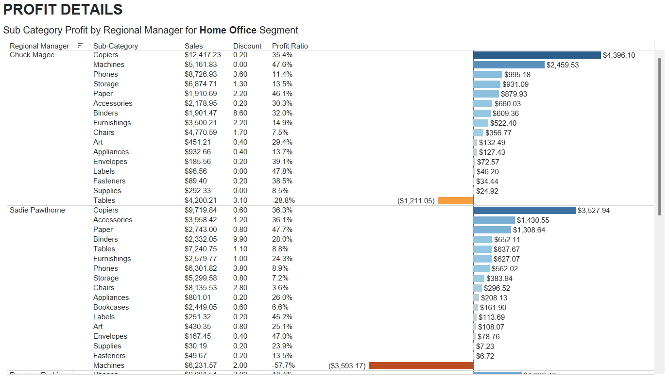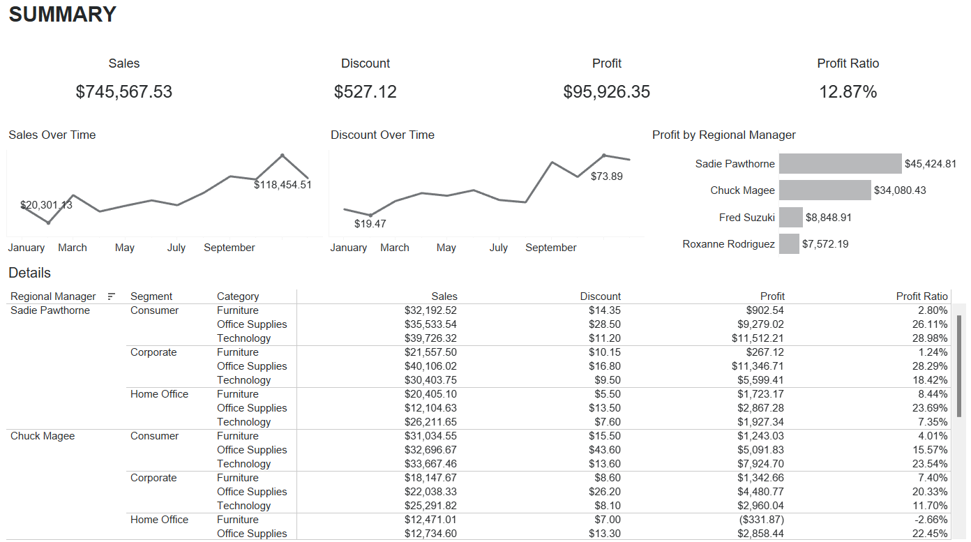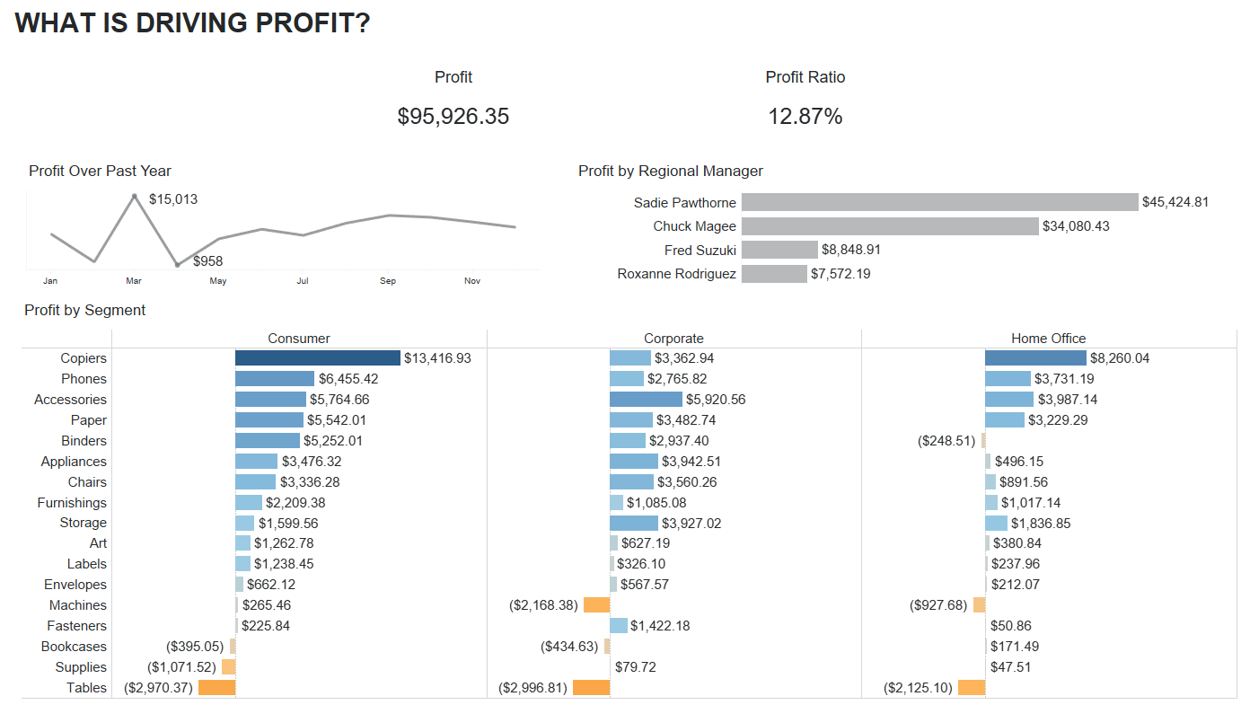 Taking that into consideration in a subsequent iteration, Figure 2 shows a better version of the same dashboard that keeps the focus on the key metrics (Profit) and removes extraneous or unnecessary information. “Profit” now takes on a more prominent part of the dashboard and not only displays historical trends, but also delivers additional insights such as the overall contributions of Regional Managers, Segments, and Categories. This new iteration of the dashboard does a much better job at answering the original question: “What are the main components and drivers of profit?”