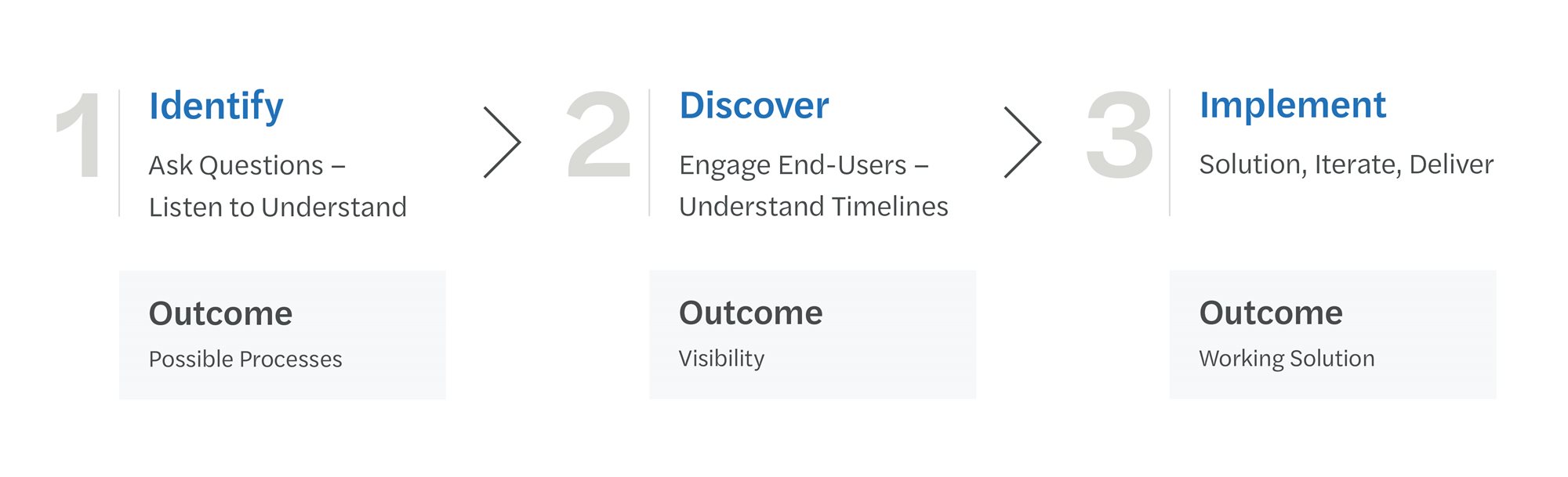 The first step in adding hyperautomation is to identify possible processes that have opportunities for automation. Once processes are identified, look to discover the viability of automation by engaging end-users to understand processes and timelines. Once a viable automation process has been determined, the last step is to implement a working solution.