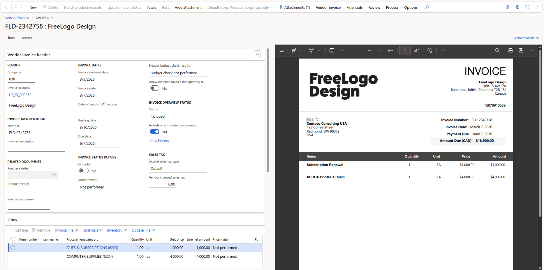 - Automatic matching of invoice lines to purchase orders and their related receipts.