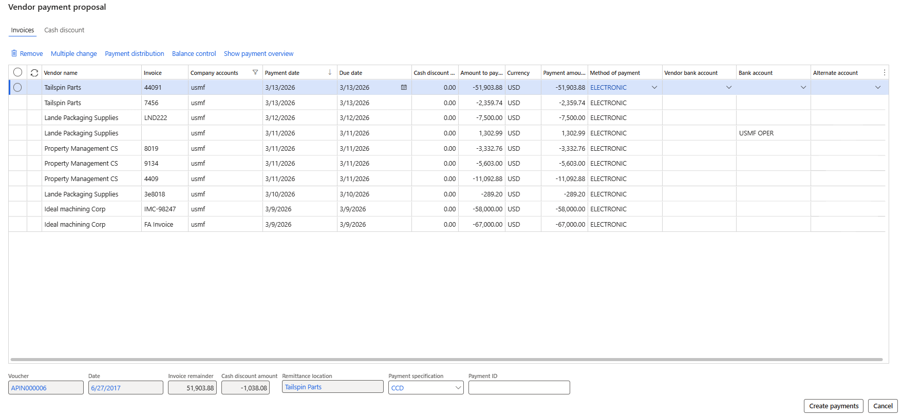 Users can adjust selections and criteria, and the vendor payment proposal invoice preview will display all applicable invoices that can be paid. From here, invoices can be selected and removed, and payment attributes of individual invoices or multiple invoices can be edited simultaneously. Once the invoice preview is ready, users can select “Create payments” to populate the vendor payment journal with the invoices to be paid.